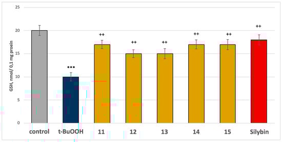 Effects of the tested compounds 11–15 and the positive control silybin, at a concentration of 50 µM, in combination with t-BuOOH (75 µM) on GSH level at isolated rat brain mitochondria. *** p < 0.001 vs. control (non-treated mitochondria); ++ p < 0.01 vs. control (pure t-BuOOH).