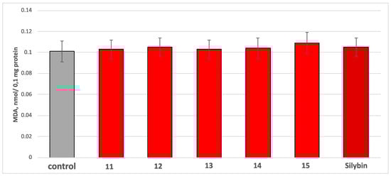 The compounds 11–15 and silybin applied alone, at a concentration of 100 µM, did not show any pro-oxidant effects on isolated rat brain microsomes. They did not alter malondialdehyde (MDA) production (Figure 11).