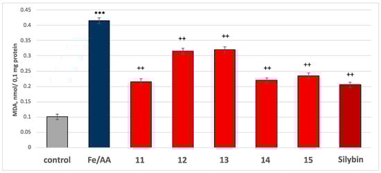 Effects of tested compounds 11–15 and silybin, at a concentration of 50 µM, under non-enzyme-induced lipid peroxidation conditions with ferrous sulfate (20 µM)/ascorbic acid (0.5 mM) on MDA production on isolated rat brain microsomes. *** p < 0.001 vs. control (non-treated microsomes). ++ p < 0.01 vs. control (pure iron/ascorbate).