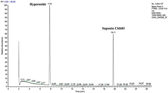 This study used UHPLC-HRMS (ultra-high-performance liquid chromatography/high-resolution mass spectrometry) to detect the flavonoids and saponins in the EtOH extract from the aerial parts of Chenopodium foliosum Asch. The efficiency of the extraction procedure and optimization of the chromatographic conditions were as given in the literature [28]. Briefly, MeOH, EtOH, and i-PrOH, as well as their mixtures with water, were used as solvents. The best results were obtained with 70% EtOH. Two chromatographic columns, namely Kromasil C18 column (Bohus, Sweden, 2.1 × 100 mm, 1.8 μm) and Kromasil Eternity XT C18 column (2.1 × 100 mm, 1.8 μm) were tested for the separation of flavonoids and saponins from the titled plant. The first column showed the best results and was chosen for method development. The quantitative determination of flavonoids and saponins in the aerial parts of Chenopodium foliosum Asch. was performed using the external standard method. Hyperoside and saponin Chfs01 (3-O-β-glucopyranosyl-2β,3β-dihydroxy-30-noroleane-12,20(29)-diene-23,28-dioic acid 28-O-β-glucopyranosyl ester) were selected as standards for the calculation of the quantity of detected flavonoids and saponins, respectively. The separation of the standard is given in Figure 13.