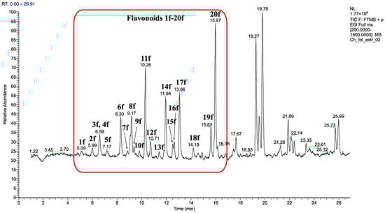 UHPLC-HRMS-based flavonoid profiling of EtOH extract from the aerial parts of C. foliosum Asch. in the positive ion mode. The red frame indicates the flavonoids in the chromatogram.