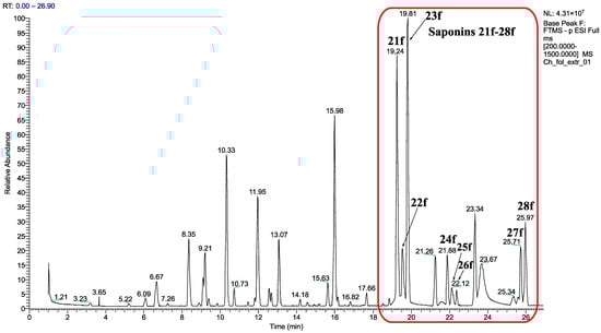 According to the MS, MS2 data, and by comparison with references, compounds 21f (tR-extr = 19.24), 23f (tR-extr = 19.81), and 28f (tR-extr = 25.97) (Table S1) were identified as 3-O-β-GluA-30-normedicagenic acid-28-O-β-Glu, 3-O-β-Glu-30-normedicagenic acid-28-O-β-Glu, 3-O-β-Glu-30-normedicagenic acid, respectively, and were previously isolated from the aerial parts of C. foliosum [10].