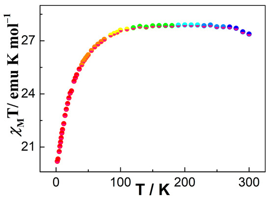 Variable-temperature dc magnetic susceptibility measurements were performed for 1 in the temperature range of 2 to 300 K under an applied magnetic field of 1000 Oe (Figure 3). The χMT value at 280 K for 1 is 27.32 cm3 K mol−1, which is close to two isolated DyIII ions at room temperature (6H15/2, S = 5/2, L = 5, J = 15/2, g = 4/3, C = 28.34 cm3 K mol−1) [75]. In the 300–100 K range, the χMT product reduces smoothly; at below 100 K, the χMT for 1 further decreases to the lowest value of 20.19 cm3 K mol−1 at 2 K. This behavior can be ascribed to possible weak inter-complex antiferromagnetic coupling and/or the thermal depopulation of Stark sublevels of DyIII ion [76]. For complex 1, the magnetization value was investigated within 2–6 K (Figure S5b). The plot of M versus H displays a steady increase with increasing field to reach the values of 10.56 Nβ for 1 at 6 K, which is lower than the theoretical value of 20 Nβ for two DyIII ions (Figure S5a) [77]. Moreover, as shown in Figure S5b, the curve of M vs. H/T displayed a non-superimposable nature, suggesting that significant magnetic anisotropies exist in 1 [78].