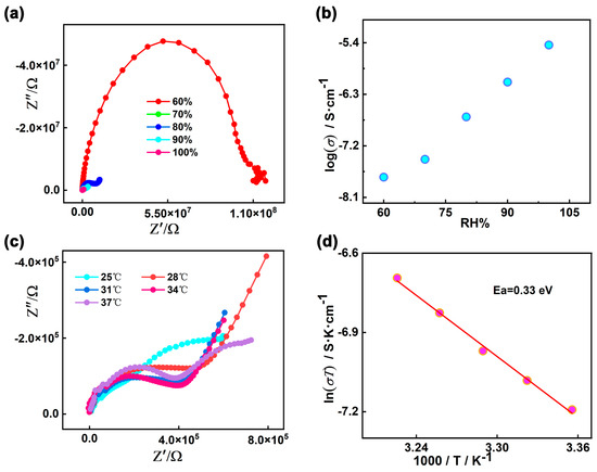 (a) Nyquist plot for 1 at 35 °C under different RH levels; (b) Plot of proton conductivity for 1 vs. RH at 35 °C; (c) Nyquist plot for 1 at different temperatures under 100% RH; (d) Plots of ln(σT) vs. 1000/T for 1 under 100% RH.