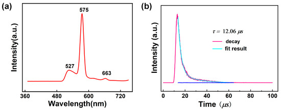 (a) Solid-state emission spectra for 1 at room temperature; (b) Decay curves of 1.