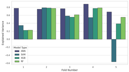 When looking at a pilot dataset, the data’s temporal nature and the MEC-AD system’s internal characteristics should be considered. Results illustrating the explained variance across the five folds are depicted in Figure 2. The analysis shows that the middle three folds tend to exhibit higher explained variance across all models. Notably, the SVM model underperforms significantly in Fold 5, with an explained variance of −0.56, adversely affecting the average performance, as reported in Table 1. This underperformance in specific folds, particularly Fold 5, can be attributed to sudden shifts in loading conditions and temperature, which pose greater challenges for models lacking the adaptability of ANNs to complex nonlinear dynamics. Traditional models like SVM are especially sensitive to noisy or outlier data, and while models such as random forest and XGBoost display reasonable efficacy during stable periods, their performance declines when operational data deviate from typical conditions.