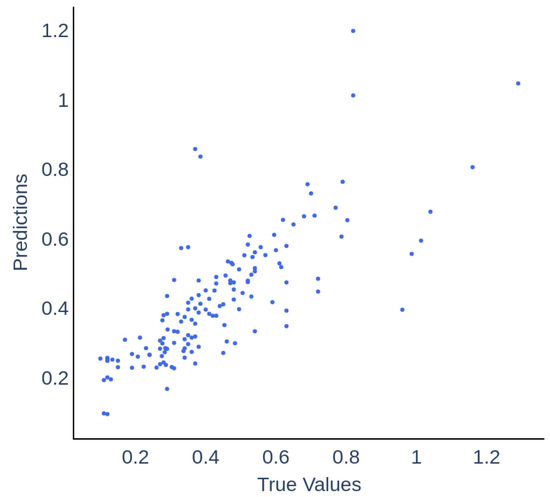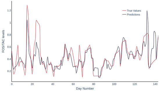 A direct comparison between true and predicted values is further compiled in Figure 6. The data points predominantly fall in the range of 0.2 to 0.6 on both axes, corresponding to periods of stable reactor operation during the field trial and indicating a prevalence of lower FOS/TAC ratios in the dataset. There is a noticeable spread in points at higher values, suggesting that the model’s accuracy may diminish as the FOS/TAC ratio increases, a trend that is quantitatively supported by the accuracies and F1 scores listed in Table 4. Specifically, this table illustrates a reduction in model accuracy from 0.79 to 0.58 and in F1 score from 0.89 to 0.73 as the FOS/TAC ratio increases from the 0.3–0.6 range to values greater than 0.6. In this context, accuracy measures the proportion of total predictions that the model correctly identifies, highlighting a decrease in the model’s ability to accurately classify reactor statuses outside the stable operating range. Similarly, the F1 score, which balances precision and recall, shows a decline, suggesting that the model becomes less precise and comprehensive in capturing all relevant instances under higher FOS/TAC conditions. From an operational perspective, even if there is a deviation from exact values at these higher levels, the overall trend can still be discerned. This allows for timely operational interventions based on the general behaviour of the system rather than on precise predictions, helping to maintain system stability and efficiency.