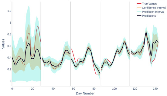 By preserving the temporal sequence in cross-validation and preventing data leakage, the model is able to learn authentic temporal patterns, which are crucial for deployment in dynamic processing environments. The methodology addresses common challenges in soft sensor development, including limited data availability and risks of overfitting. A depiction of the true versus predicted values, plotted over the course of the trial, is presented in Figure 4. During the initial folding phase, representing the startup phase, undetected events may have compromised data integrity, leading to increased uncertainty in the early predictions of the model. This is evidenced by the expanded confidence intervals and prediction intervals. Figure 5 presents an adjusted plot showing a 5-day moving average along with the prediction and confidence intervals. In the final trial month, reduced offline data sampling frequency necessitated linear interpolation to align online data with offline data, potentially degrading data quality. This is reflected in the broader prediction intervals and diminished confidence levels in later stages, indicative of the model’s decreased predictive reliability due to inconsistent data inputs. Data at both trial ends often showed range extremities, potentially limiting the generalisation capabilities of models trained without these folds.