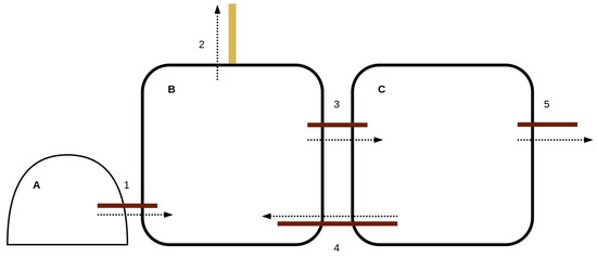 Block-flow diagram depicting the operational reactor setup. Components and flows are labelled as follows: (A) waste equalisation tank, (B) primary MEC-AD reactor, (C) effluent holding tank, (1) feeding inlet, (2) gas outlet, (3) tank 1 outlet, (4) sludge recirculation, (5) effluent outlet.