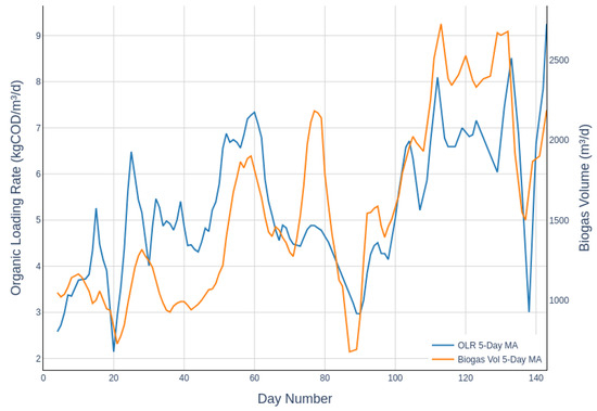 Trends in organic loading rate (OLR) and biogas volume over the trial period. The lines represent 5-day moving averages for both parameters.