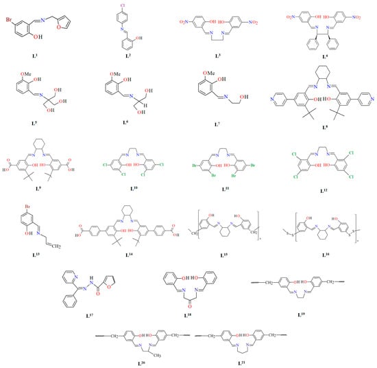 Scheme of N,O-donor Schiff base ligands using for coordination of selected metal ions L22 [80], L23 [81], L24 [81], L25 [1], L26 [82], L27 [83], L28 [84], L29 [85], L30 [86], L31 [87], L32 [88], L33 [4], L34 [4], L35 [89], L36 [89], L37 [90], L38 [90], L39 [91], L40 [92].