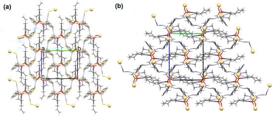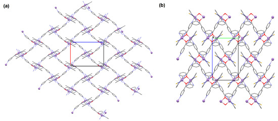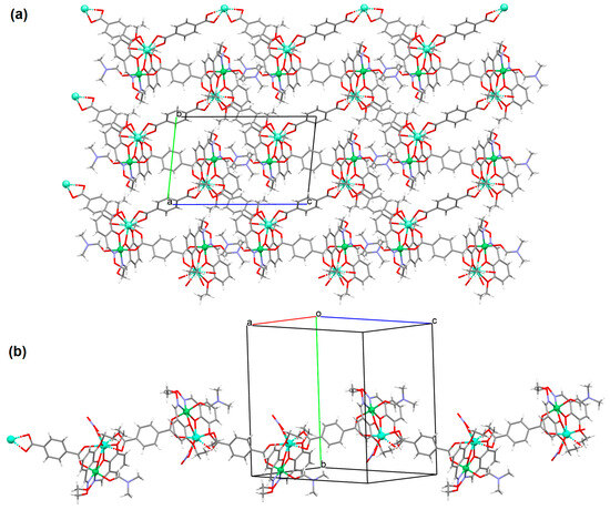 The coordination polymers: (a) 2D layered framework of 11; (b) 3D framework of 12 (Table 1) [33,72,93]. Solvent molecules and hydrogen atoms are omitted for clarity.