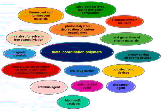 Their unique properties, straightforward synthesis often following with green chemistry rules, and easy availability of reagents are increasing the interest of researchers. Vanadium complexes are mainly under investigation for their use as catalysts in organic synthesis or for their biological or sorption properties (Figure 35). V-CPs highly stable polymeric structures help maintain the structural feature required for catalytic activity during the reaction. The vanadium coordination polymers are mainly studied as catalysts in oxidation reactions, e.g., cyclohexene, trans-stilbene, styrene, isoeugenol, pyrogallol, but can also be used in epoxidation (e.g., alkene, cycloalkene) or cyanation of aldehyde processes. The sorption properties of vanadium polymers are also proving useful. Some complexes are being investigated for their ability to absorb small molecules such as H2 and CO2, which can be used in gas storage and separation. Coordination polymers of other metal ions also have a much wider range of applications due to their different properties, as shown in Figure 36. These compounds are mainly tested for their biological activity, e.g., antiviral, antimicrobial, anticancer. Their catalytic properties, not only in organic synthesis but also as photocatalysts or electrocatalysts, are of great interest. In recent years, there has been growing interest in the development of metals coordination polymers for use in new technologies, such as energy and electronic materials. Similarly to V-CPs, the coordination polymers of other metals are characterized by a good sorption capacity not only for small molecules such as CH3OH, N2, H2, O2, and CO2 but also for larger molecules such as dyes.