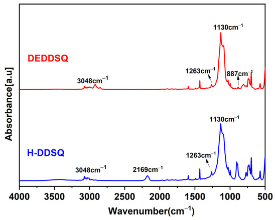 Figure 1 shows the infrared spectra of H-DDSQ and DEDDSQ. By comparing the two spectra, the characteristic peak of Si-H disappeared at 2169 cm−1, while the characteristic peak of the epoxy group appeared at 887 cm−1. Additionally, the stretching vibration peak of Si-CH3 appeared at 1263 cm−1, the stretching vibration peak of Si-O appeared at 1130 cm−1, and the characteristic peak of the benzene ring appeared at 3048 cm−1. These observations indicate that DEDDSQ was successfully synthesized.
