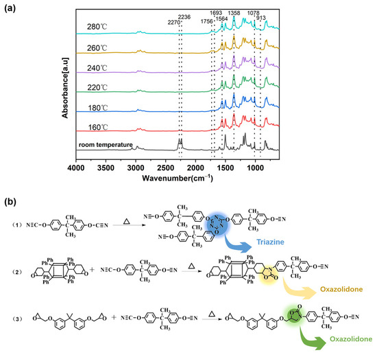 (a) FT-IR spectra of CE/E51/DEDDSQ at different temperatures in the curing process and (b) main reactions of CE/E51/DEDDSQ resin: (1) Self-aggregation of CE; (2) Reaction between DEDDSQ and CE; (3) Reaction between E51 and CE.