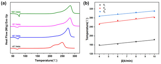 (a) DSC curves of CE/E51/8.0DEDDSQ at different heating rates; (b) Heating rate temperature curve of CE/E51/DEDDSQ obtained by extrapolation method.
