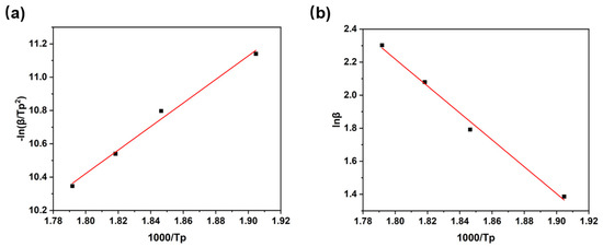 The Kissinger and Ozawa equations were used to find the respective activation energies, and then the average of the two was taken as the apparent activation energy, E. The activation energy was calculated using the Kissinger equation and the Ozawa equation, respectively. The Kissinger equation is shown in Equation (2):
