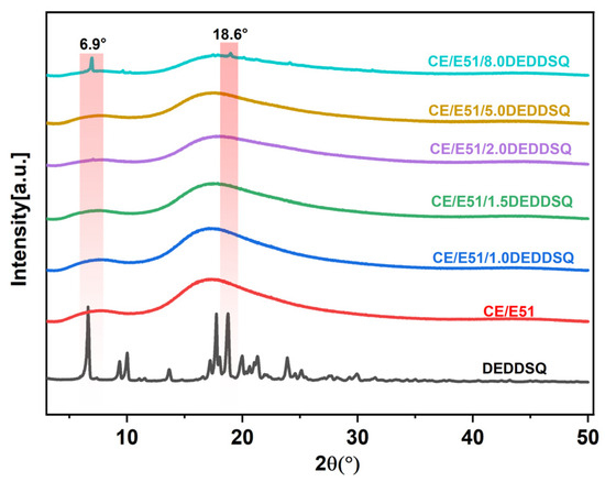 XRD spectra of CE/E51/DEDDSQ nanocomposites.