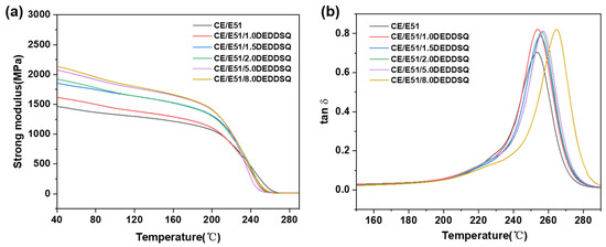 (a) Storage modulus and (b) tan δ for CE/E51/DEDDSQ nanocomposites.