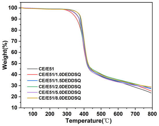 TGA curve of CE/E51/DEDDSQ nanocomposites.