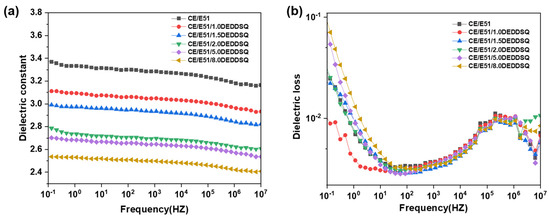 (a) Dielectric constant of CE/E51/DEDDSQ nanocomposites and (b) dielectric loss of CE/E51/DEDDSQ nanocomposites.