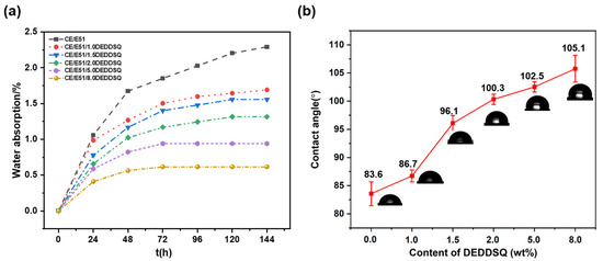 (a) Water absorption of CE/E51/DEDDSQ nanocomposites and (b) contact angles of CE/E51/DEDDSQ nanocomposites.