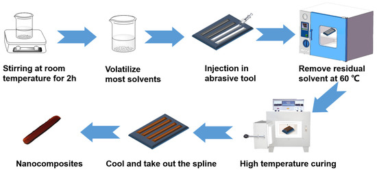 The preparation process of CE/E51/DEDDSQ nanocomposites is shown in Figure 13, The DEDDSQ and CE/E51 (mass ratio: 8:2) were stirred and mixed in dichloromethane. The content of DEDDSQ was 0 wt%, 0.5 wt%, 1.0 wt%, 2.0 wt%, 5.0 wt%, and 8.0 wt%, respectively. After stirring for 2 h, most of the solvent was volatilized in the air, and the remaining solvent was dried in a vacuum oven to obtain the CE/E51/DEDDSQ nanocomposite mixture. The obtained mixture was cured and formed according to the curing process of 160 °C/2 h, 180 °C/2 h, 200 °C/2 h, 220 °C/2 h, 240 °C/2 h, and 260 °C/2 h, respectively, to obtain the CE/E51/DEDDSQ nanocomposite spline.