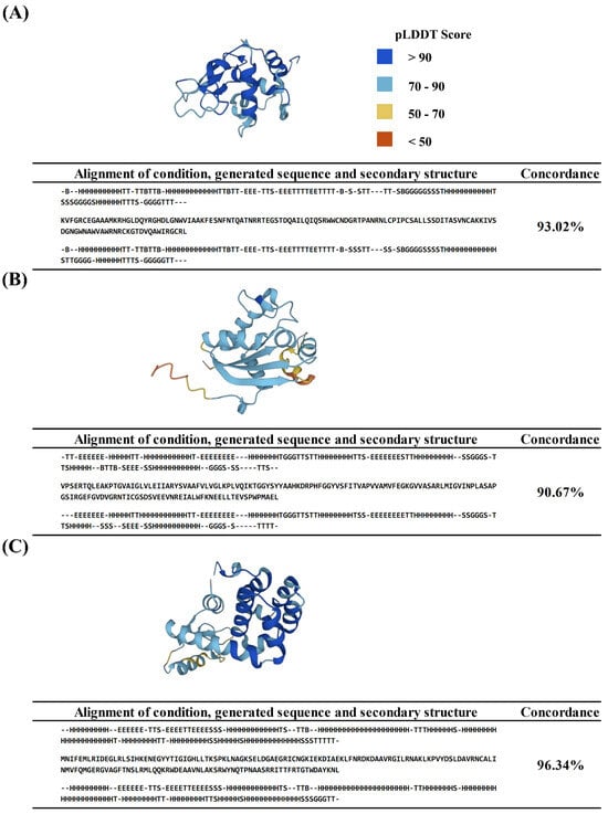 The generated results under the first 3 conditions of 6 distinct conditions from the (A) 4HTQ A chain (129 residues), (B) 1HHQ A chain (150 residues), and (C) 5JGR A chain (164 residues). For each condition, the folding structures of the generated sequences with the highest conformity predicted by ESMFold (top panel in each sub-figures), and the alignments of the condition sequence, generated sequence, and corresponding secondary structure sequence (bottom panel in each sub-figures). In the folding structures panel, the color of the residues represents the pLDDT Score range: dark blue for >90, light blue for 70–90, yellow for 50–70, and red for <50.