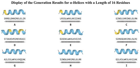 The primary structure, secondary structure, and folding structure of the best sequence generated through 50 consecutive generations under the condition of 16-residue α-helices by our PPD model. Each subplot illustrates, from top to bottom: (1) ESMFold-predicted structure of 16-residue α-helix designed by our PPD model, (2) the corresponding primary structure, and (3) per-residue secondary structure calculated via DSSP algorithm. The designed polypeptides demonstrate high structural reliability, significant sequence diversity, and strict adherence to the generative condition.