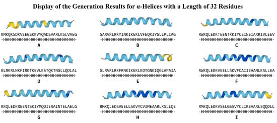 Next, we conducted homological analysis on the top nine sequences generated by the PPD model under each condition (corresponding to the sequences displayed in Figure 2 and Figure 3), using NCBI’s BLASTp to search against the non-redundant protein database. The results of the homological analysis are presented in Table 2 and Table 3. The sequences generated by our model demonstrate novelty, with some exhibiting very low identity to natural proteins. For instance, sequence D in Table 3 has 75% query cover and 83.33% identity with HEU0216558.1, and sequence C in Table 4 has 90% query cover and 68.97% identity with 2WQ0 A chain, among others. Our model is even capable of de novo designing polypeptide sequences that have never been observed in natural proteins, such as A, B, D, F, G, and I in Table 3. However, in Table 2, there are no sequences that are entirely absent from natural proteins. This could be attributed to the abundance of natural α-helices with 16 residues, and the possible combinations are relatively limited, thus increasing the likelihood of overlap between the generated sequences and natural protein sequences.