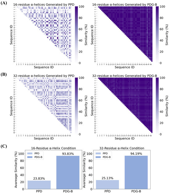 Generative diversity analysis of generated sequences under different α-helix conditions. (A,B) Heatmaps depict the pairwise similarities among the 50 sequences generated under 16- (A) and 32- (B) residue α-helix conditions, respectively. Each cell represents the similarity score between two sequences, with darker shades indicating higher similarity. (C) Average similarity comparison between PPD and PDG-B model under both conditions.
