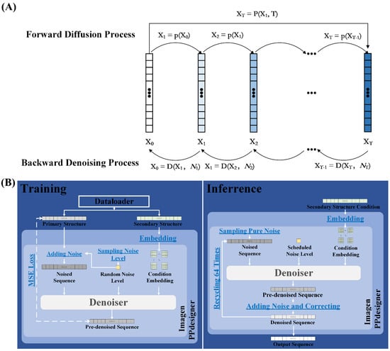 As illustrated in Figure 6B, the training and inference phases are implemented independently and, respectively, in our model. During the training phase, the primary and secondary structure sequences, dispensed by the Dataloader, are passed to PPdesigner. PPdesigner is responsible for embedding the secondary structure conditional sequences and subsequently forwarding them along with the primary structure sequences to Imagen. Imagen then samples random noise levels to control the intensity of noise added to the primary structure sequences. The noised primary structure sequences, the sampled noise levels, and the embedded secondary structure conditions are jointly fed into Denoiser for denoising, producing a pre-denoised sequence. Finally, Imagen computes the model’s loss function and optimizes the parameters.