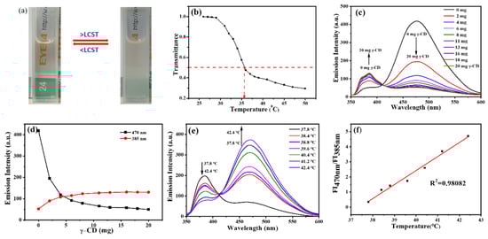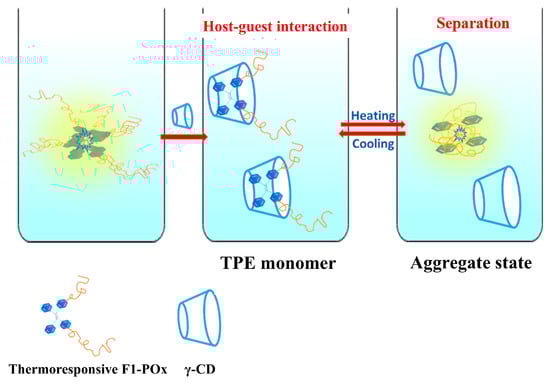 The variation in fluorescence spectra of F1-POx in the presence of γ-CD as a function of increasing temperature was systematically investigated. The fluorescence intensity at 470 nm gradually increased, accompanied with a decrease at 385 nm, and an obvious ratiometric fluorescence response was observed (Figure 1e). There is a good linear relationship between the ratiometric fluorescence (F470/F385) and the temperature in range of 37.8–42.4 °C (Figure 1f). According to the linear relationship, the sensitivity for temperature was calculated as high as 274%/°C. To our best knowledge, the highest sensitivity of all reported thermometers is about 38%/°C [40]. The sensitivity of F1-POx with γ-CD is nearly 7-fold higher than the data. In addition, the solution showed fully reversible ratiometric fluorescence change without any attenuation after four sets of temperature change (Figure S7). The above results may be due to the hydrophilic POx chains becoming hydrophobic with increasing temperature. Correspondingly, the hydrophobicity of whole molecule of F1-POx would increase, resulting in the discharge of γ-CD from the host–guest complex (Figure 2).