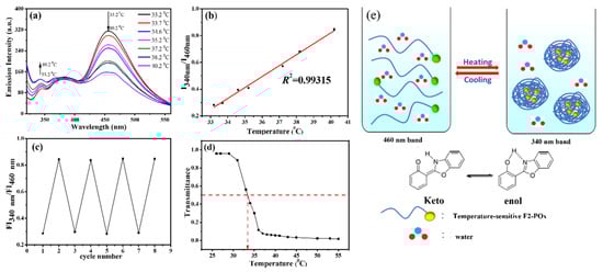 F2-POx showed two emission peaks at 340 and 460 nm, which are attributed to the normal isomer (N* enol emission) and tautomer (T* keto emission) of HBO units, respectively [41]. With increasing temperature, the intensity of the enol emission gradually increased, while the keto emission intensity at 460 nm decreased (Figure 3a). A good linear relationship between the ratiometric fluorescence (F340/F460) and temperature was observed in the range of 33.2–40.2 °C (Figure 3b), demonstrating the potential applicability in biological systems close to 37 °C. The sensitivity was calculated to be approximately 28.6%/°C. The ratiometric fluorescence could be fully recovered without any change after four cycles of heating and cooling, indicating excellent reversibility for temperature sensing (Figure 3c). ESIPT process of HBO moiety producing keto emission is sensitive to environment changes. The LCST value of F2-POx is 34 °C (Figure 3d). As the temperature goes up, F2-POx would undergo phase transition, and the weak hydrogen bonding interactions between HBO units and water would switch to the relatively strong intra- and/or intermolecular ones between HBO units and POx chains, resulting in the ratiometric fluorescence response (Figure 3e).