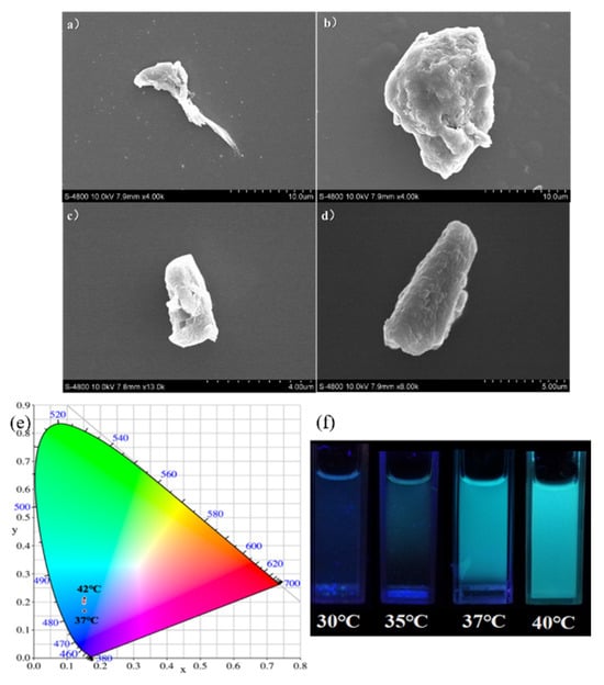 SEM image of sensor F1-POx in aqueous solution at (a) room temperature, (b) 40 °C, (c) room temperature with excess γ-CD, (d) 40 °C with excess γ-CD. (e) CIE chromaticity diagram showing the (x, y) color coordinates of F1-POx in the presence of γ-CD (20mg) as a function of temperature. (f) Photographs of aqueous solutions of F1-POx in the presence of γ-CD (20mg) at different temperatures, excited using a 365 nm UV handheld lamp.