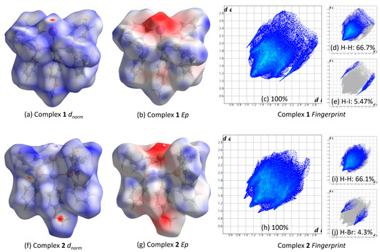 The Hirshfeld surface of complexes 1 and 2 mapped over dnorm (a,f) and molecular electrostatic potential (b,g). Two-dimensional global (c,h), H⋅⋅⋅H (d,i), and H⋅⋅⋅halide/halide⋅⋅⋅H (e,j) decomposed atom pairwise fingerprint plots of complexes 1 and 2.