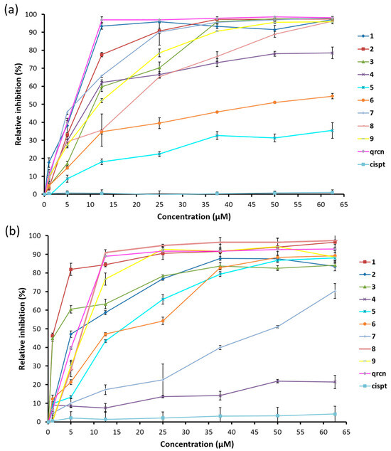 Inhibitory effect of increasing concentrations (1–100 µM) of Pd-based complexes (1–9) compared to Qrcn on the chemiluminescence produced by the HRP-H2O2/L-012 system.