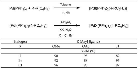 Thanks to this procedure, the six complexes with the generic formula [PdX(PPh3)2(4-RC6H4)] (with R = H, OMe, OAc, and X = Cl or Br) were obtained and fully characterized.
