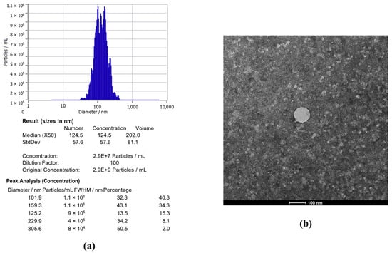 L. mesenteroides subsp. DB-21 strain was cultured using de Man, Rogosa, and Sharpe (MRS) broth at 30 °C and 200× g for 18 h and then centrifuged at 4000× g for 15 min to recover the culture supernatant. The collected supernatant was filtered using a 0.22 μm pressure-sensitive filter (SPL, Pocheon, Republic of Korea). The exosomes were subsequently purified using an Äkta flux S (Cytiva, Amersham, UK) instrument with a tangential flow filtration (TFF) system, where a hollow fiber cartridge with 0.5 mm fiber ID, 110 cm flow path, and 100,000 nanomolecular weight cut-off (NMWC) pore size was used as the TFF filter.