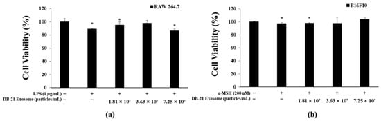 Cell viability of DB-21 exosomes on lipopolysaccharide (LPS)-stimulated RAW 264.7 cells and alpha-melanocyte-stimulating hormone (α-MSH)-induced B16F10 melanoma cells. (a) Cell viability of RAW 264.7 macrophage cells. (b) Cell viability of B16F10 melanoma cells. The cytotoxicity of RAW 264.7 cells was determined using the 3-(4,5-dimethylthiazol-2-yl)-2,5-diphenyl-2H-tetrazolium bromide (MTT) assay for LPS (1 μg/mL)-stimulated cells in the presence of DB-21 exosomes (1.81 × 107, 3.63 × 107, and 7.25 × 107 particles/mL). The cytotoxicity of B16F10 cells was determined using the MTT assay for α-MSH (200 nM)-stimulated cells in the presence of DB-21 exosomes (1.81 × 107, 3.63 × 107, and 7.25 × 107 particles/mL). Results are expressed as percentages compared with the respective values obtained for the control. * p < 0.05.