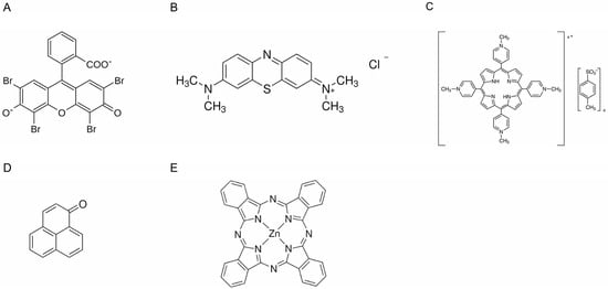 Chemical structures of employed photosensitizers: Eosin Y (A), Methylene Blue (B), TMPyP (C), PN (D), ZnPc (E).