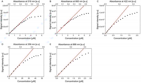 Intensity of singlet oxygen phosphorescence with increasing concentrations of photosensitizers: Eosin Y in PBS-D2O (A); Methylene Blue in PBS-D2O (B); TMPyP in PBS-D2O (C); PN in THF (D); ZnPc in THF (E). The red line denotes the linear fit to the linearly aligned points at lower concentrations. The experiments were performed in triplicate (n = 3) yielding similar results; however, to increase clarity, only a single series for each photosensitizer is plotted.