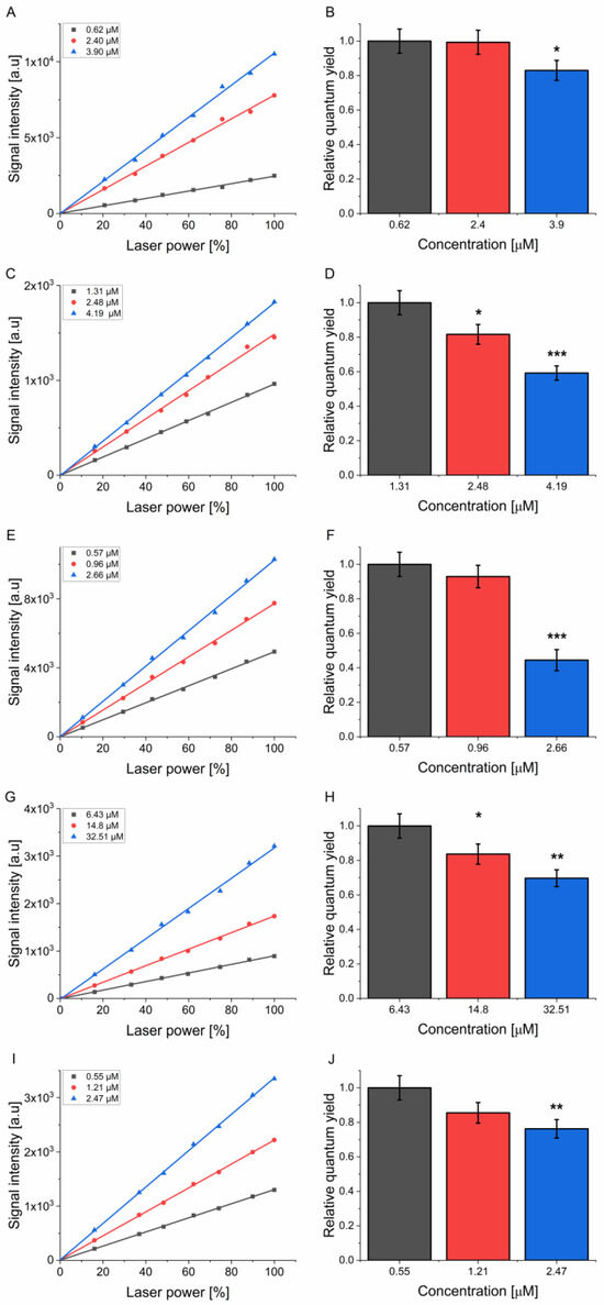 Singlet oxygen quantum yields determined at different photosensitizer concentrations (left column). Calculated ratios (normalized to lowest concentration) of quantum yield at given concentrations of PS (right column). (A,B)—Eosin Y (in PBS-D2O); (C,D)—MB (in PBS-D2O); (E,F)—TMPyP (in PBS-D2O); (G,H)—PN (in THF); (I,J)—ZnPC (in THF). The experiments were performed in triplicate (n = 3), yielding similar results; however, to increase clarity, only a single series for each photosensitizer is plotted in A,C,E,G,I. Statistical significance was tested using ANOVA with Tukey’s post hoc test, with asterisks denoted as follows: * p < 0.05, ** p < 0.01, *** p < 0.001.
