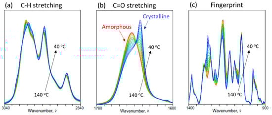 Figure 1 shows the overlaid spectral plots of three pertinent regions of the ATR IR spectra of PHBHx (12 mol% 3HHx) undergoing the non-isothermal crystallization process from the amorphous melt at 140 °C to the semicrystalline state at 40 °C. The effect of the crystal growth at the expense of the amorphous melt component is well reflected by the changes in the spectral intensities of IR bands. For example, spectral variations in the C-H stretching region (Figure 1a) are dominated by the increasing contributions of IR intensities associated with the crystalline component around 2975, 2968, 2932 and 2875 cm−1 and decreasing contributions from the amorphous component around 2984 and 2942 cm−1. Moieties contributing to the molecular vibrations for these bands are obviously placed in different local environments characteristic to ordered crystal lattice and random amorphous coils.