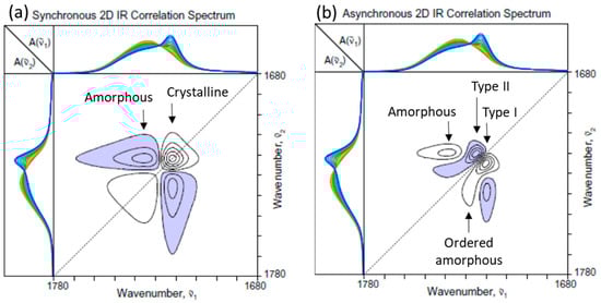 The reason for the asynchronicity between the crystalline 1720 cm−1 band and the amorphous 1736 cm−1 band may be understood by the appearance of an additional cross peak pair around (1720, 1724) and (1724, 1720). It appears that there are two distinct populations of crystalline contributions, such that the amorphous component is further consumed to create the second crystalline component at 1724 cm−1 even after the growth of the 1720 cm−1 component has slowed down. The presence of two types (I and II) of crystalline components during the melt crystallization of PHBHx has been observed in the past [1,2,15,16,17,18,19]. The type I crystal found at around 1720 cm−1, which grows first, is believed to have a well-ordered lattice structure, corresponding most likely to the volume-filling lamellae of the crystalline spherulites. In turn, the type II crystal, which grows later, is speculated to have a less ordered structure associated with the secondary crystals formed within the confined inter-lamellar spacing. While the two types of PHBHx crystals exhibiting distinct growth behaviors are vividly revealed in the asynchronous 2D-COS plot (Figure 2b), it is actually rather difficult to detect the difference by a cursory observation of the set of 1D spectra, like the one shown in Figure 1b.