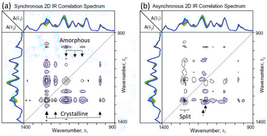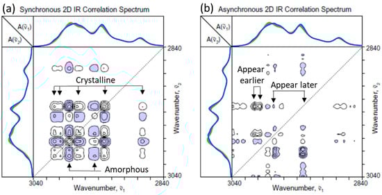 Figure 6 shows the hetero-mode correlation between the fingerprint and C=O stretching region. Once again, the asynchronous spectrum (Figure 6b) suggests that the crystalline signals in the fingerprint region are behaving somewhat differently from the well-ordered type I crystal at around 1720 cm−1 of the C=O stretching region. Compared to the C-H stretching region, however, the coordinates of the synchronous cross peaks for the apparent crystalline contributions in the fingerprint region are even closer to 1722 cm−1. The result suggests that the IR signals increasing during the crystallization process in the fingerprint region are not necessarily originating from a distinct population of the crystalline species.