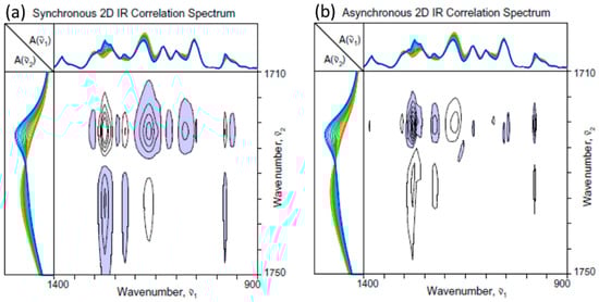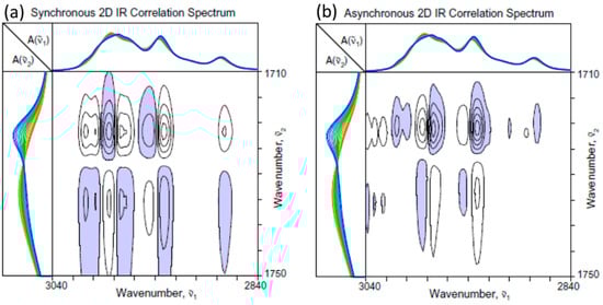 Synchronous spectrum corresponds to the covariance of spectral intensity variations. It characterizes the simultaneous or coordinated changes in band intensities at two IR wavenumbers and . The magnitude of the so-called autopeak appearing at the main diagonal position, i.e., , represents the extent or variance of the spectral intensity at a given coordinate. Peaks appearing in the off-diagonal positions of a 2D-COS map are called cross peaks. If the sign of a synchronous cross peak at a coordinate position is positive, i.e., , the measured IR spectral intensities at and are either increasing or decreasing together in the same direction. The intensities are changing in opposite directions for a negative cross peak.