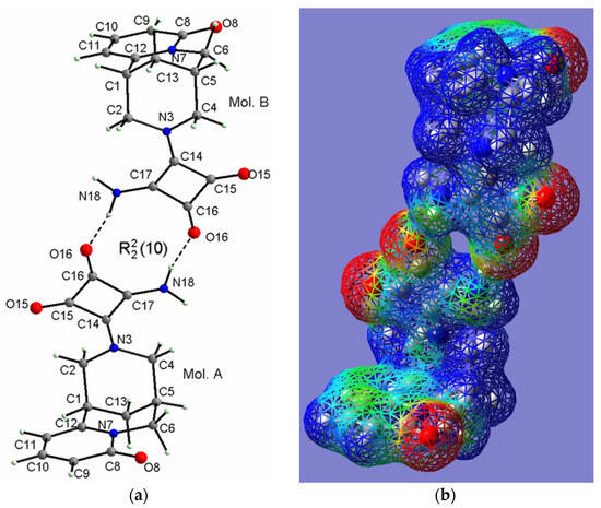 In crystal 2, the (−)-cytisine squaramide molecules A and B in the asymmetric unit interact with each other through a pair of N–H⋯O hydrogen bonds, forming a dimeric structure with a graph of The formation of a dimeric structure with a graph of takes place between the fragments of molecules with different signs of electrostatic potential (Figure 3b). Since molecules A and B form dimeric structures in the crystal, the geometry optimization for such dimers was performed using the DFT methods. The optimized conformation of such an AB dimer is shown in Figure 4, while detailed geometrical parameters are listed in Table S1c (in Supplementary Materials). The energy stabilization of such a dimeric structure (AB) is 16.19 kcal/mol (67.75 kJ/mol), which is a measure of the strength of the pair of N–H⋯O hydrogen bonds, with a graph of forming the dimer, compensating for the slight energy increase in Mol B, and stabilizing the AB dimer. The 3D molecular electrostatic potential mapped onto the total electron density isosurface (0.008 eÅ−3) for the AB dimer is shown in Figure 4b, which is helpful for elucidating the interactions between the AB dimers.