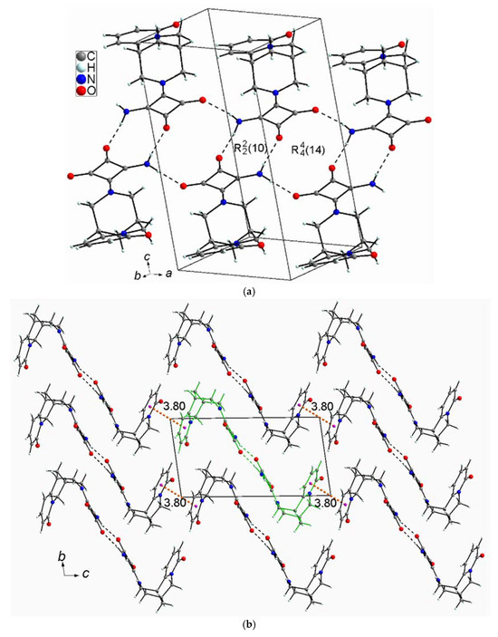 Translationally related dimers are linked with each other along the a-axis using a pair of N–H⋯O hydrogen bonds with a graph of to form a chain (Figure 5a). The chains are translationally related along the c and b axes and are stabilized by weak stacking interactions between the pyridine rings. The distance of ~3.80 Å between the centers of gravity of the pyridine rings in the stacks indicates a weak π⋯π interaction stabilizing the crystal structure (Figure 5b).