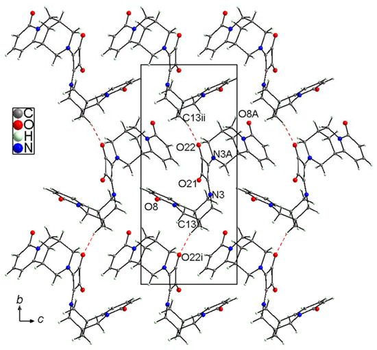 The arrangement of (−)-cytisine squaramide 5 molecules in the crystal is mainly determined by van der Waals forces and electrostatic interactions between molecular fragments characterized by the opposite EP signs. Additionally, the molecules related by a twofold screw axis are linked into chains along the b-axis through weak C–H⋯O interactions (Figure 14). The H⋯O distance is approximately 2.41(2) Å, and the C–H⋯O angle is about 140°. Between these chains, such interactions are significantly weaker over much longer distances.
